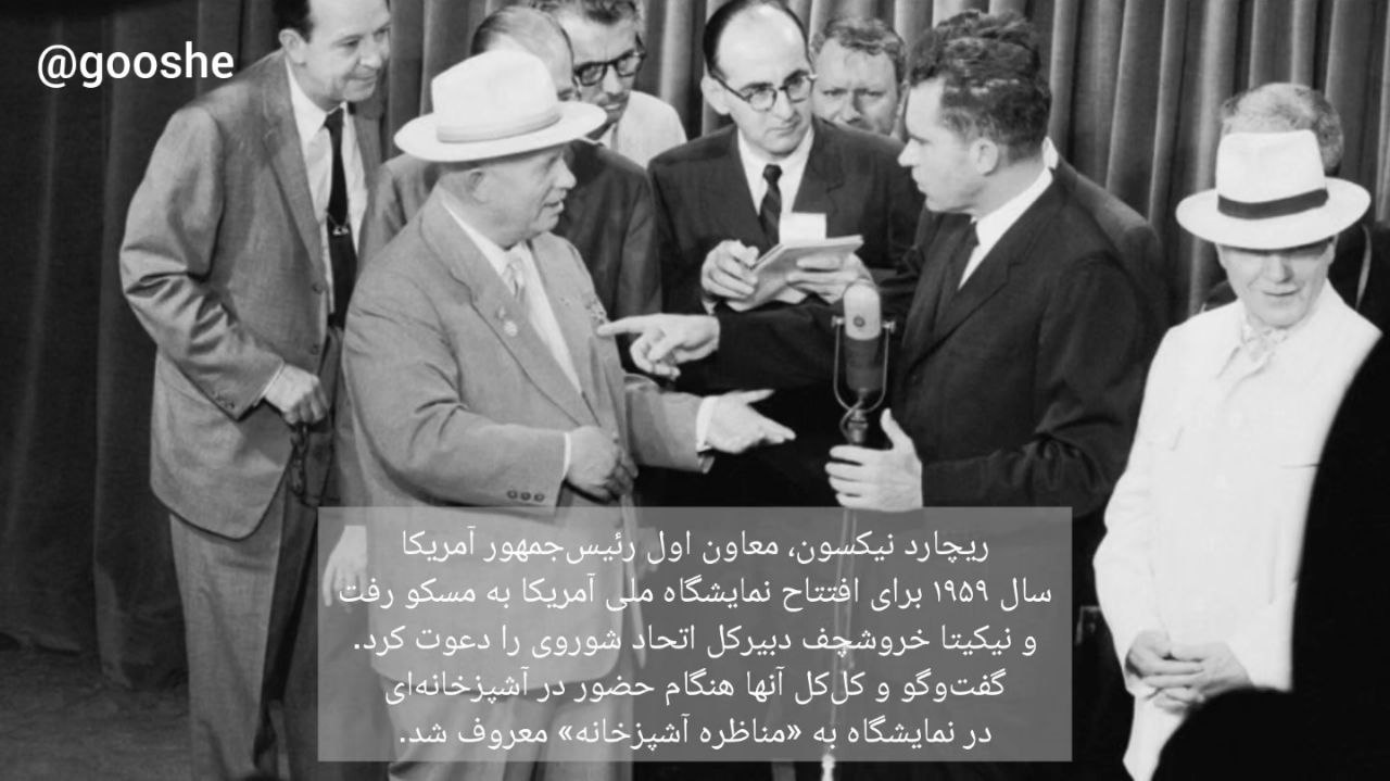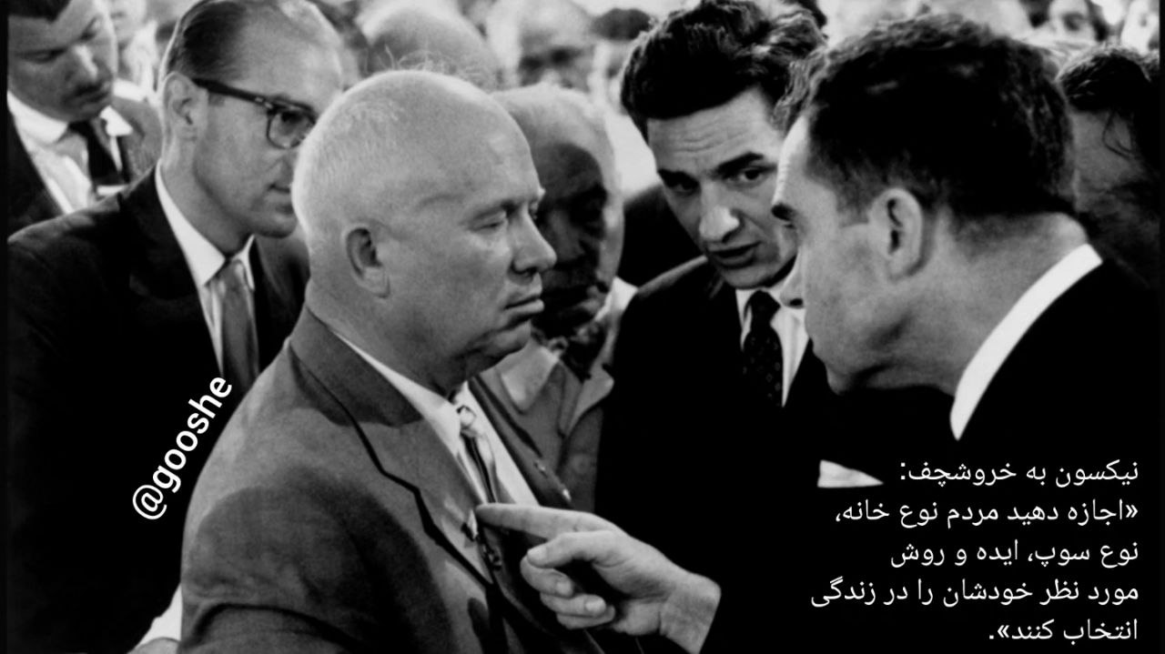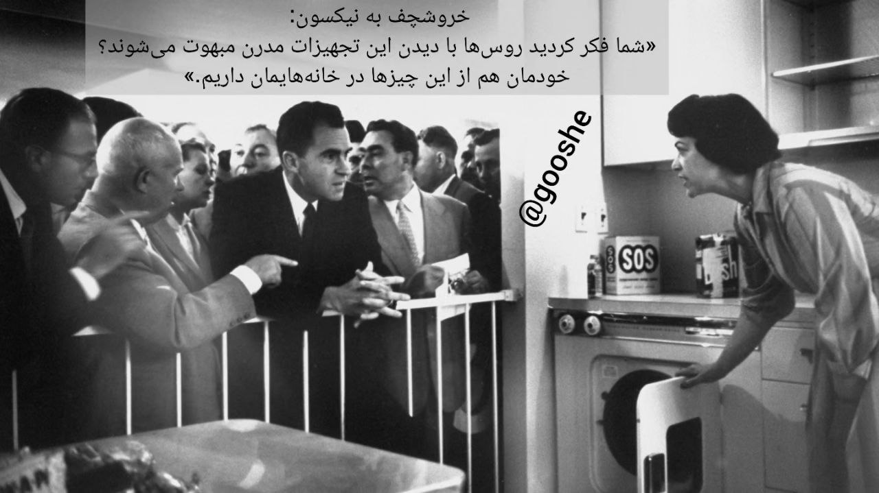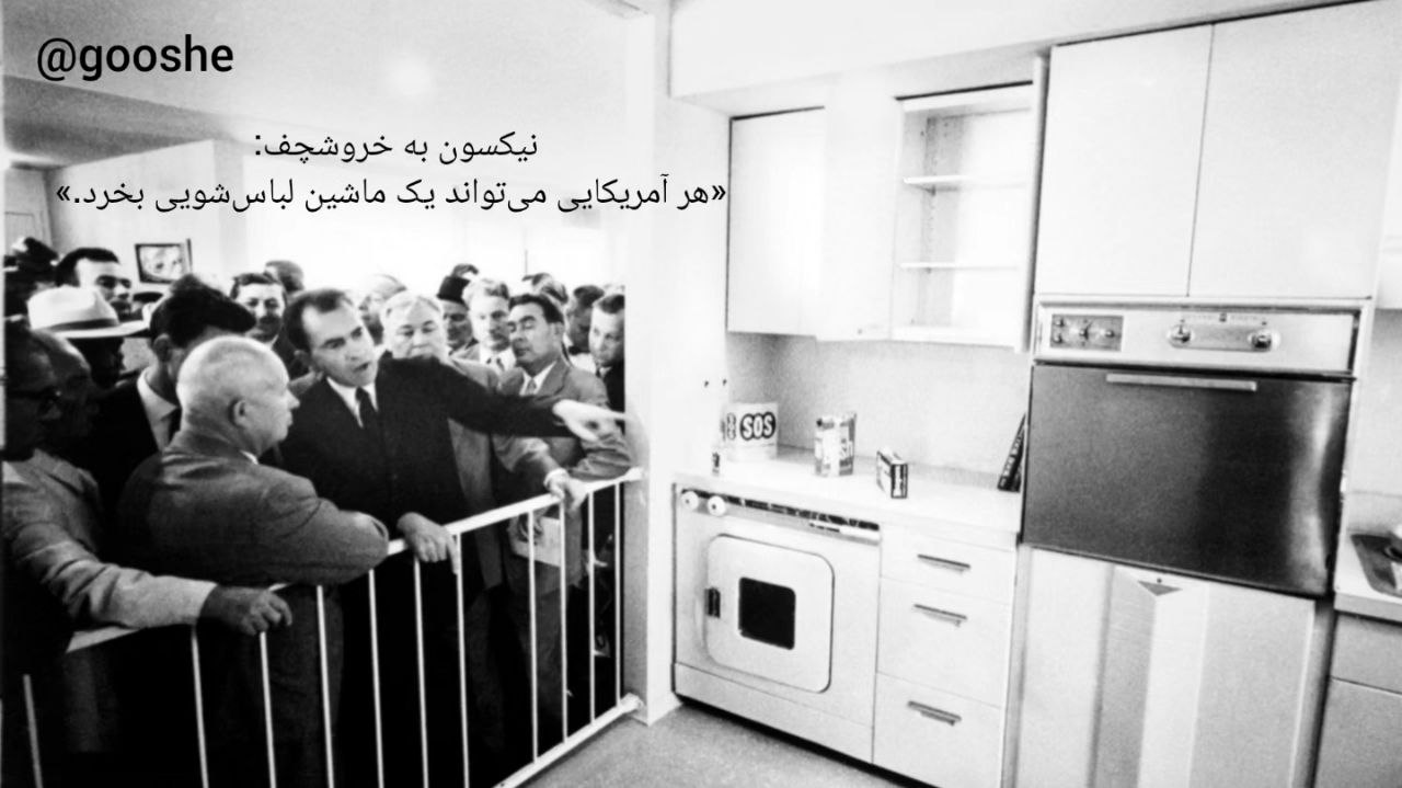 خروشچف که هاج و واجی بازدیدکنندگان را میدید و اختراعهای جدید در قالب وسایل خانه و آشپزخانه گیجاش کرده بود، با تمسخر جواب داد: «ما همین حالا این چیزها را در خانههایمان داریم و تا هفتسال دیگر از سطح تکنولوژی شما جلو میزنیم و منتظرتان میمانیم و برایتان دست تکان میدهیم تا به ما برسید.»