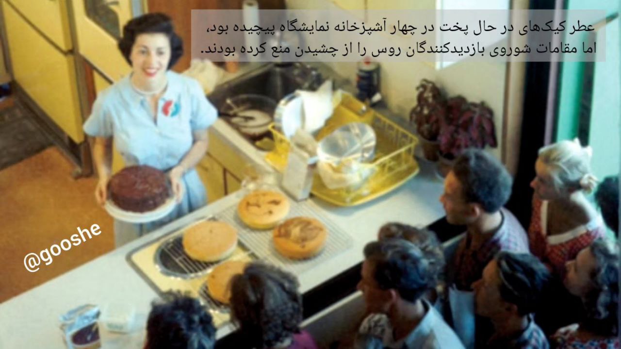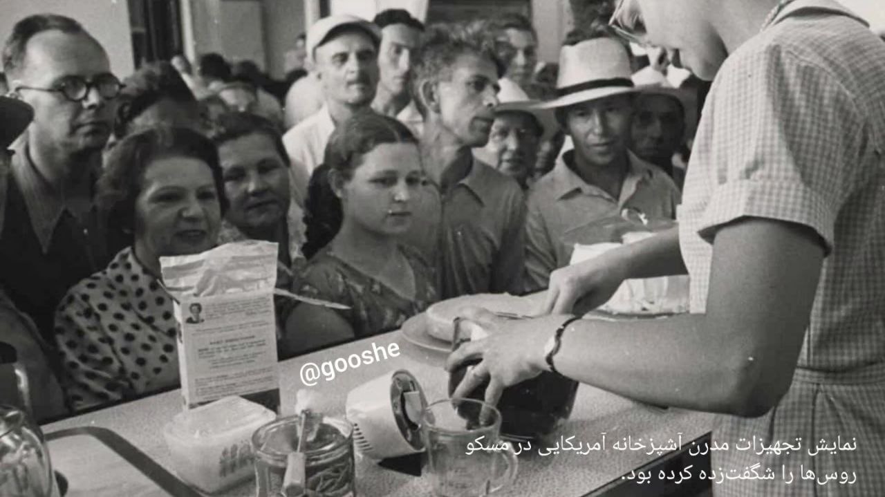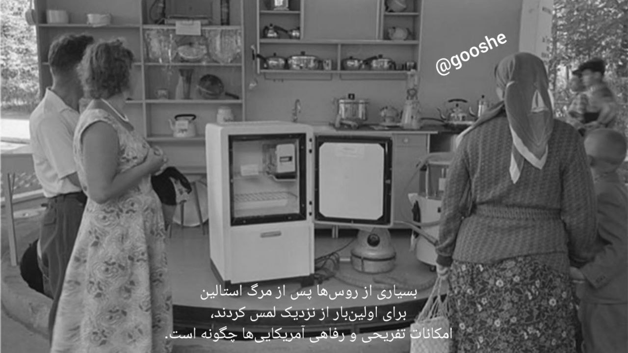 تابستان ۱۹۵۹، ششسال پس از مرگ استالین، مردی که خواسته بود به جبر و زور و اعدام و تبعید همه مردم شوروی را شبیه به هم کند، ایالات متحده، دشمن اصلی استالیندوستان، در مسکو «نمایشگاه ملی آمریکا» را برگزار کرد. هدف، نمایش زندگی مردم آمریکا بود؛ خانههایشان، پوشش و سر و وضع آدمها، تجهیزات پیشرفته در آشپزخانه، نحوه خریدکردن، رفتار فروشنده، سازنده و کارفرما با مشتریها و اساسا نشاندادن آنچه رنگ و تنوع و انتخابهای شخصی با زندگی و روان آدمها میکند.